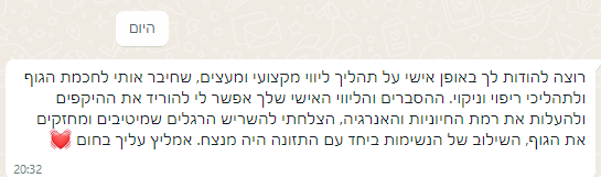 בנוסף, תקבלי שאלון התאמה אישית שעלייך למלא בטרם תחילת תוכנית הליווי אונליין.